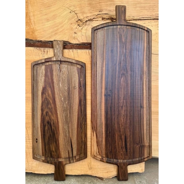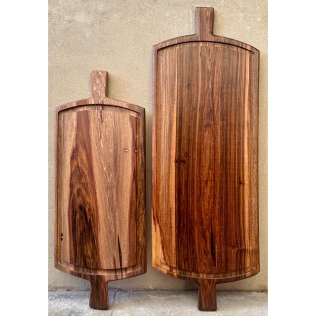 Tabla de madera guayubira con mangos en ambos extremos y canaleta en el borde